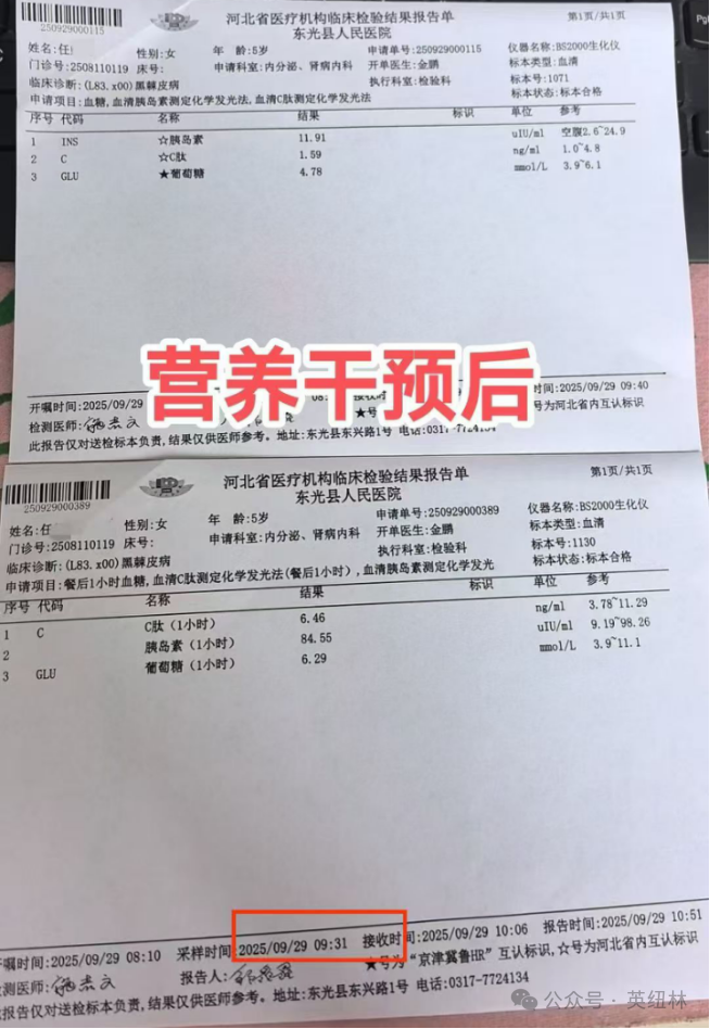 干预一个多月后,9月29日的检测报告非常明显地看到,孩子的空腹胰岛素和餐后1小时胰岛素都恢复到正常范围内,血糖值也一样正常。