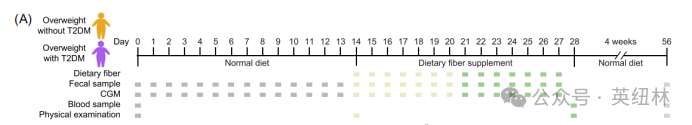本研究采用“每日采样 + 多组学分析” 的硬核设计,以19名超重患者(含9名2型糖尿病患者)为对象,BMI平均约27.7kg/m2;通过14天正常饮食观察期 + 14天膳食纤维干预期(低剂量18g /天干预7天、然后高剂量36g /天干预7天)+ 4周随访期;每日粪便采样监测微生物组成和代谢物的变化。同时使用连续血糖监测(CGM)技术,全天候追踪参与者的血糖波动。具体结果如下: