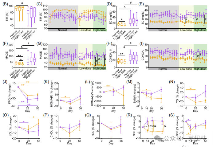 TIR(B,C)、血糖标准差(D,E)、⾎糖波动幅度(F,G)、连续重叠净⾎糖作⽤(H,I)、空腹⾎糖(J)、胰岛素抵抗指数(K)、胰岛素分泌指数(L)、体重指数(M)、⽢油三酯(N)、低密度脂蛋⽩(O)、总胆固醇(P)、⾼密度脂蛋⽩(Q)、收缩压(R)和舒张压(S)